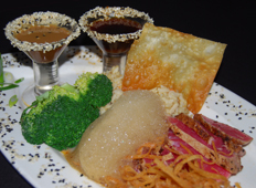 Our first entrée choice was the Hawaiian Style Big Eye Tuna with Wonton Crisps (above left). If you like your tuna rare, then this pan seared creation is a dish you will most certainly love. The tuna is complimented by a ponzu lime teriyaki sauce (above right). It is served with a side of fresh and crisp broccoli and one of Chef Jeanine’s renowned foams that added a gentle soy flavor. The plate was also garnished with a wasabi flower for an added kick. This dish paired well with a glass of Riesling.