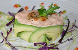 The Aguacates Relleno (above right) was our next appetizer to be sampled. This skillfully crafted cylinder of avocado was filled with a creamy sauce and crowned with a grilled-to-perfection shrimp. The lettuce and red garnishments provided a crunchy contrast to the smooth sauce and avocado. Overall, this dish was pleasing to both palate and pupils. As we continued on our avocado adventure, we were given the Grilled Shrimp and Lime Avocado Salad (below left). Do not neglect the warm dressing on the side; the flavor is outrageous and has a delicate lime finish. The avocados were equally astounding as their predecessors, and the mixed greens were fresh, but what really shone were the tender shrimp, full of smoked BBQ flavor. Be sure to share this refreshing salad with your tablemates.